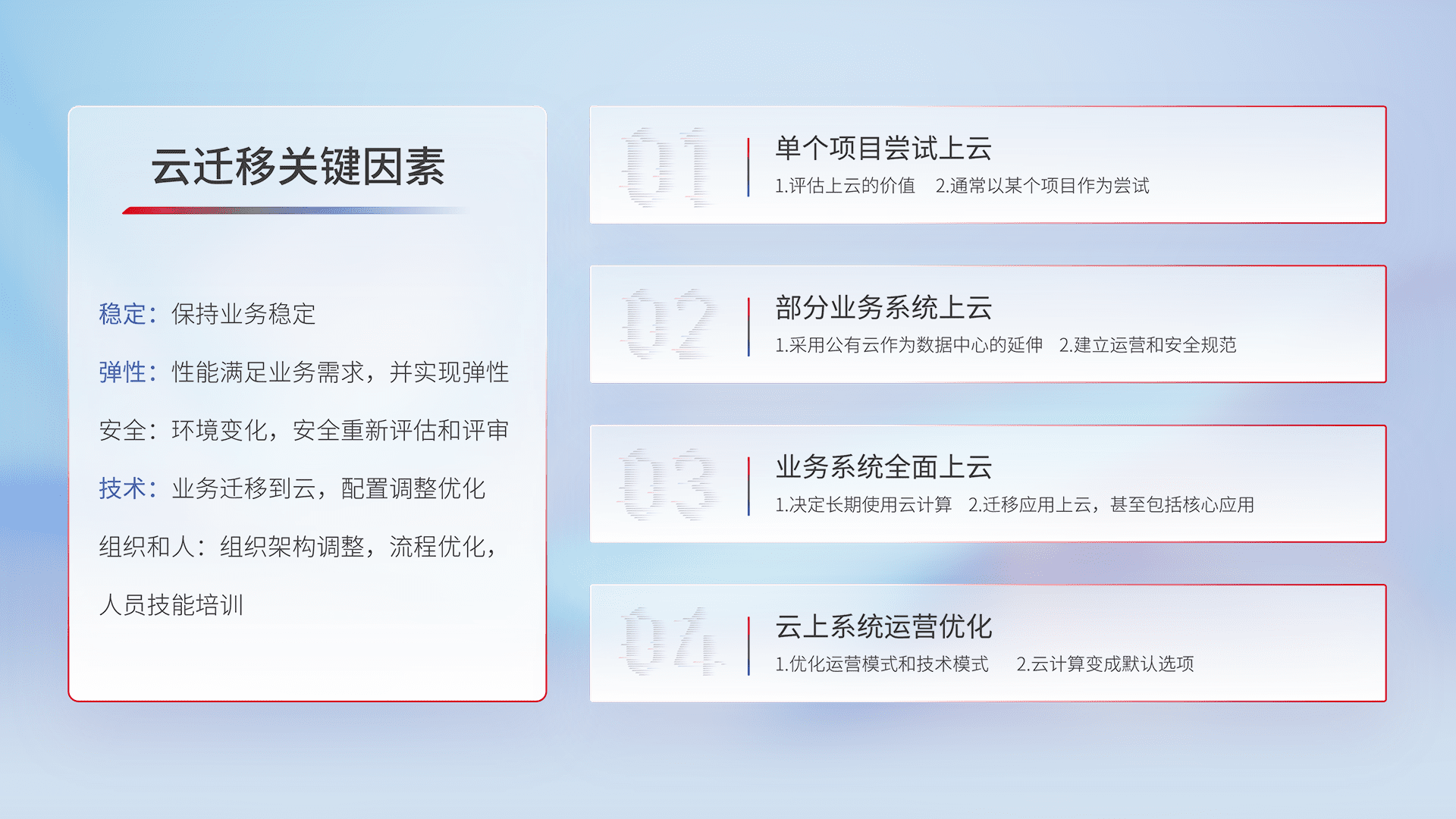 结合实际业务,,,,从规划设计、、、、云平台选型、、云原生改造、、、数据迁移、、、、集成交付,,,迁移全过程为客户识别最佳上云路径,,,,做好风险识别管理,,设计网络架构、、、、身份权限、、、、安全审计合规、、操作审计、、、、日志审计、、、、监控告警策略、、多站点容灾设计等,,对云上基础设施进行整体规划,,,提升IT治理水平,,,以满足弹性、、高可用、、高性能的需求。。
