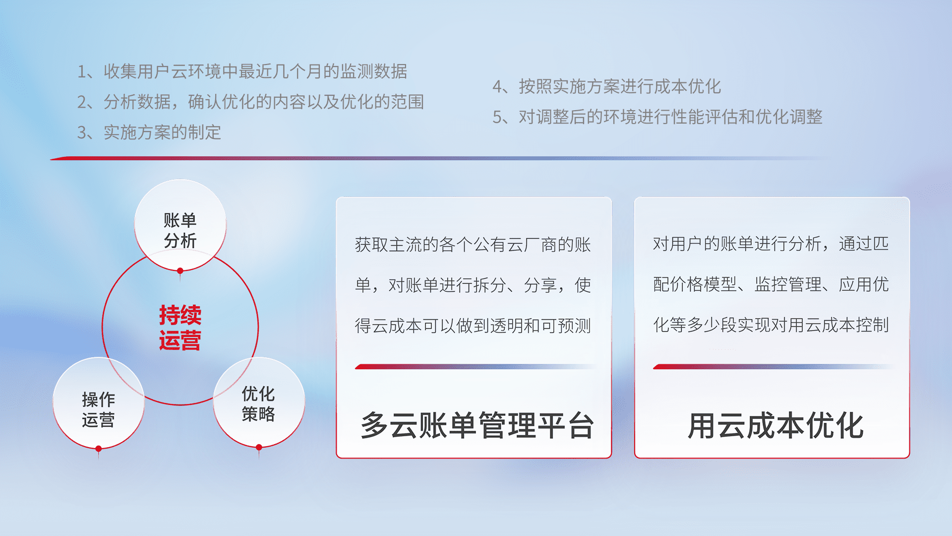 通过多云纳管,,以统一的资源数据模型把客户的云资源进行抽象和封装,,,进而实现对多云资源的统一操作,,,,保障云资源管理的可靠性、、、、稳定性与可用性。。量身定制化运维内容,,,,配置、、开发运维、、、、补丁管理、、、备份、、、监控、、、、认证和访问管理、、、审计和日常巡检等,,保障在用云过程中的可靠度,,稳定度以及高可用率。。